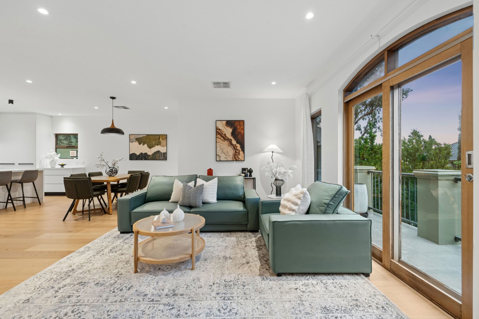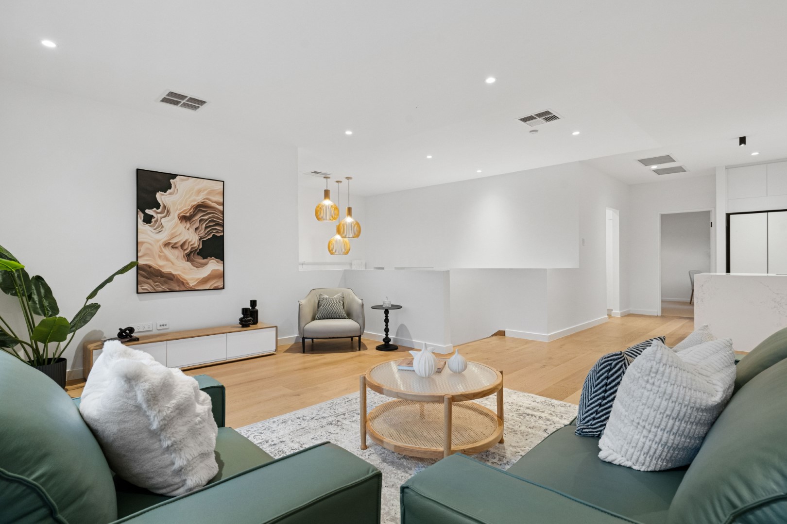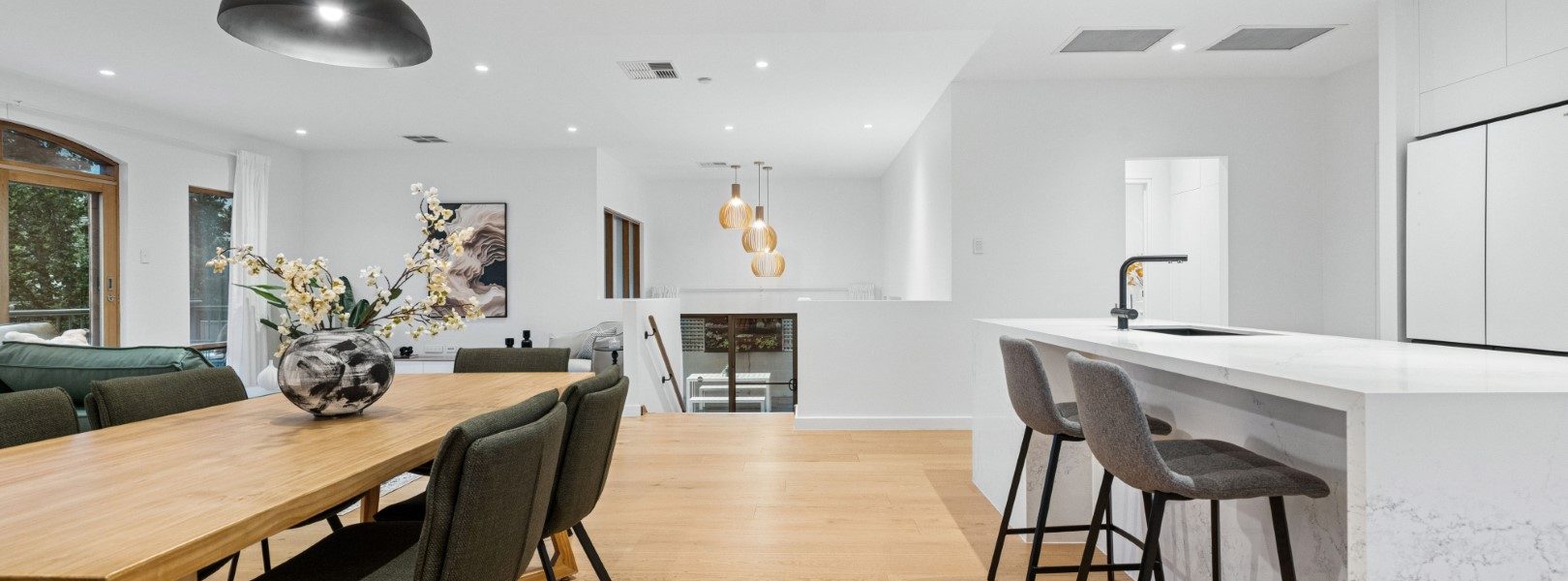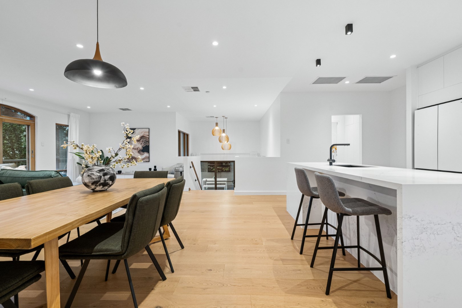 全屋贯穿着充盈的光线、温暖的质感与开阔的空间感。三层分布匠心布局,提供五间卧室、三间浴室与多个起居空间,皆以树梢景致为框景,既保证隐私,又兼顾家庭互动。