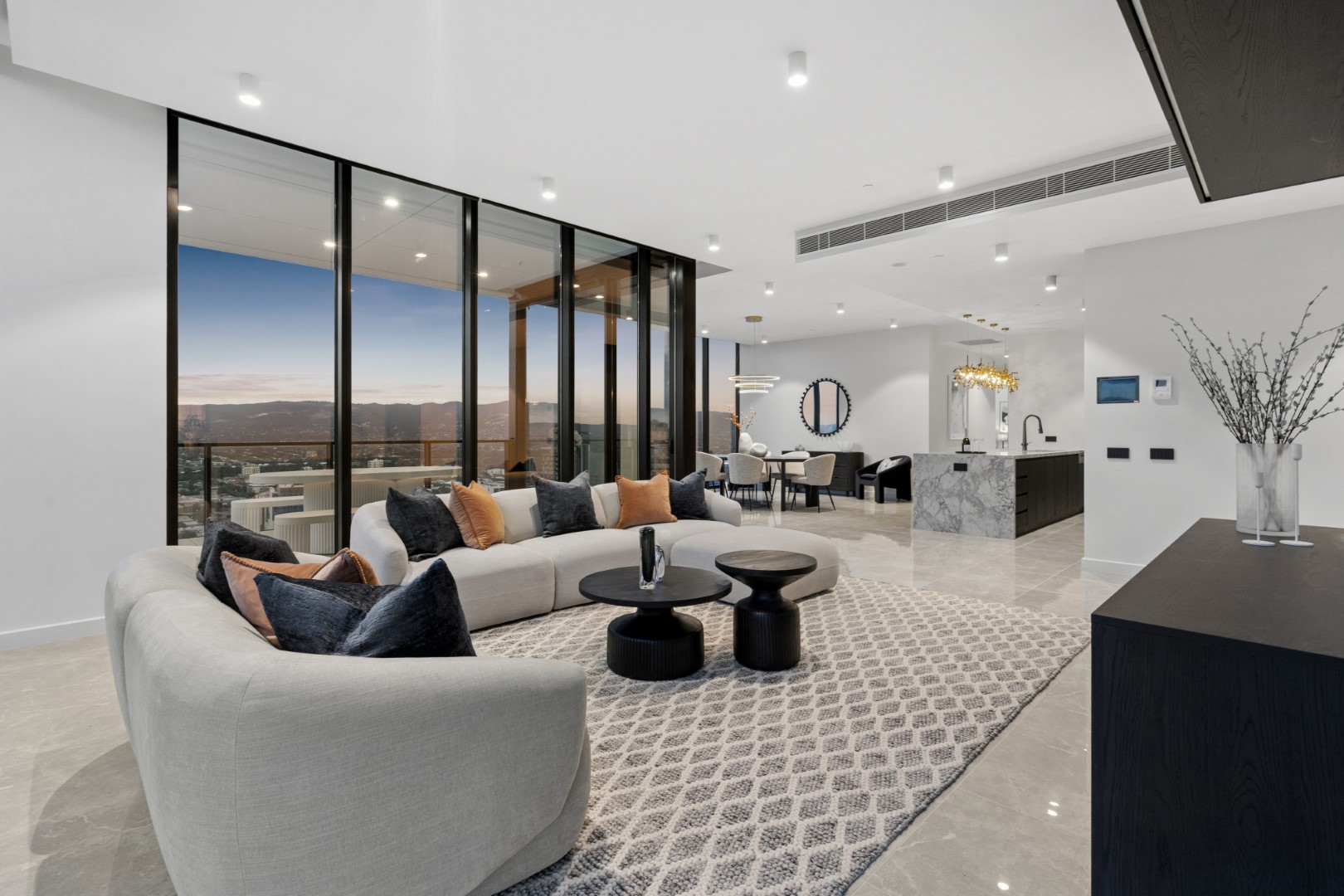 穿过私属玄关,迎面而来的是顶层才拥有的尺度整面落地玻璃幕墙将城市、海岸线与山峦尽收眼底。